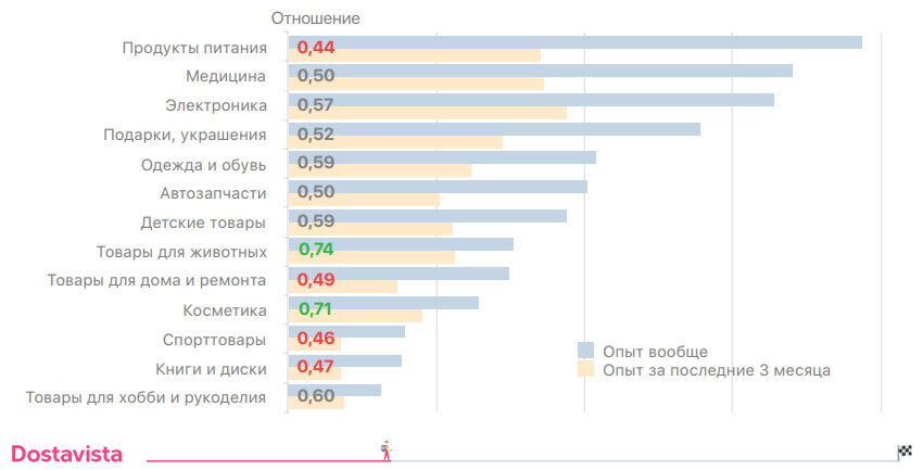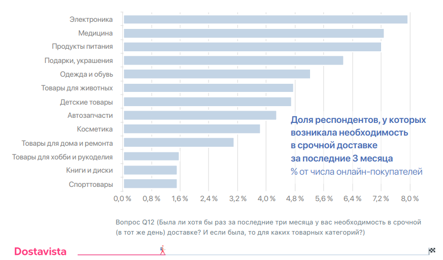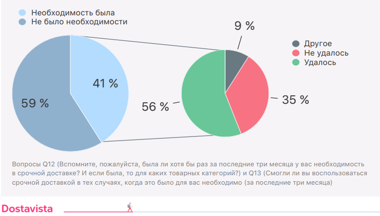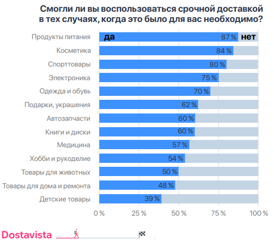 Интересно, что покупателям спорттоваров, электроники обычно удается воспользоваться срочной доставкой, в то время как покупателям детских товаров или товаров для дома и ремонта удается это сделать меньше, чем в половине случаев.