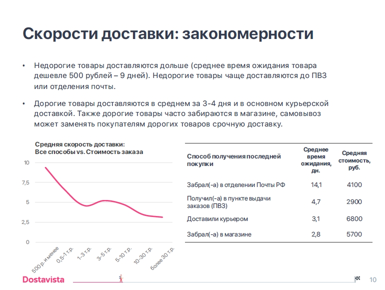 Недорогие товары чаще всего доставляются дольше (среднее время ожидания товара дешевле 500 рублей – 9 дней). При этом такие покупки чаще доставляются до ПВЗ, постамата или отделения почты.