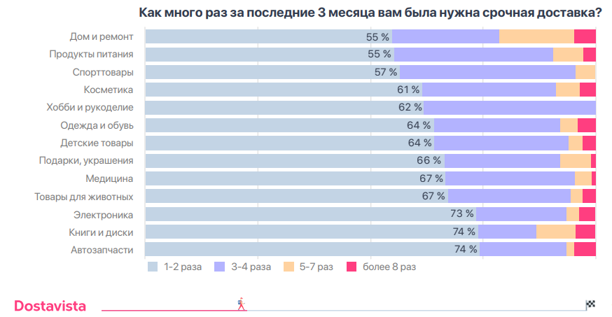В ряде категорий потребность в срочной доставке возникает более регулярно: это зоотовары, косметика и, в меньше степени, детские товары и одежда. И наоборот, несмотря на популярность категории продукты питания, срочная доставка в ней чаще носит разовый (форс-мажорный) характер.