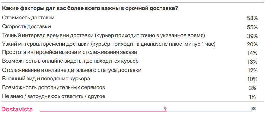 В первую очередь важна, конечно, стоимость доставки. Так ответило 58% респондентов. В число других самых важных факторов вошли пунктуальность курьеров и узость интервала доставки.