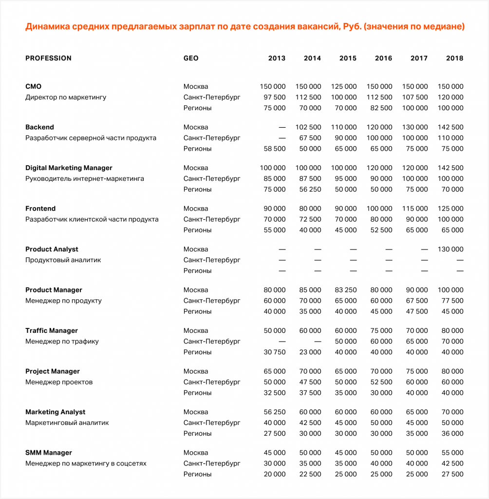 Кроме того, на рынке существует тренд углубления экспертизы. Например, если ранее за весь маркетинг в интернет-канале отвечал один специалист, то теперь это может быть целая команда: Digital Media Planner, Digital Project Manager, Paid Search Specialist CRM Manager, SMM-специалист.