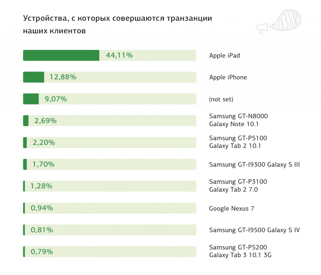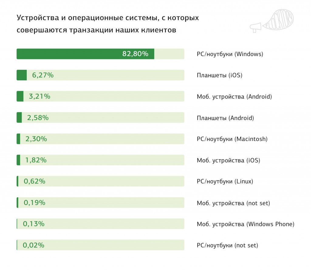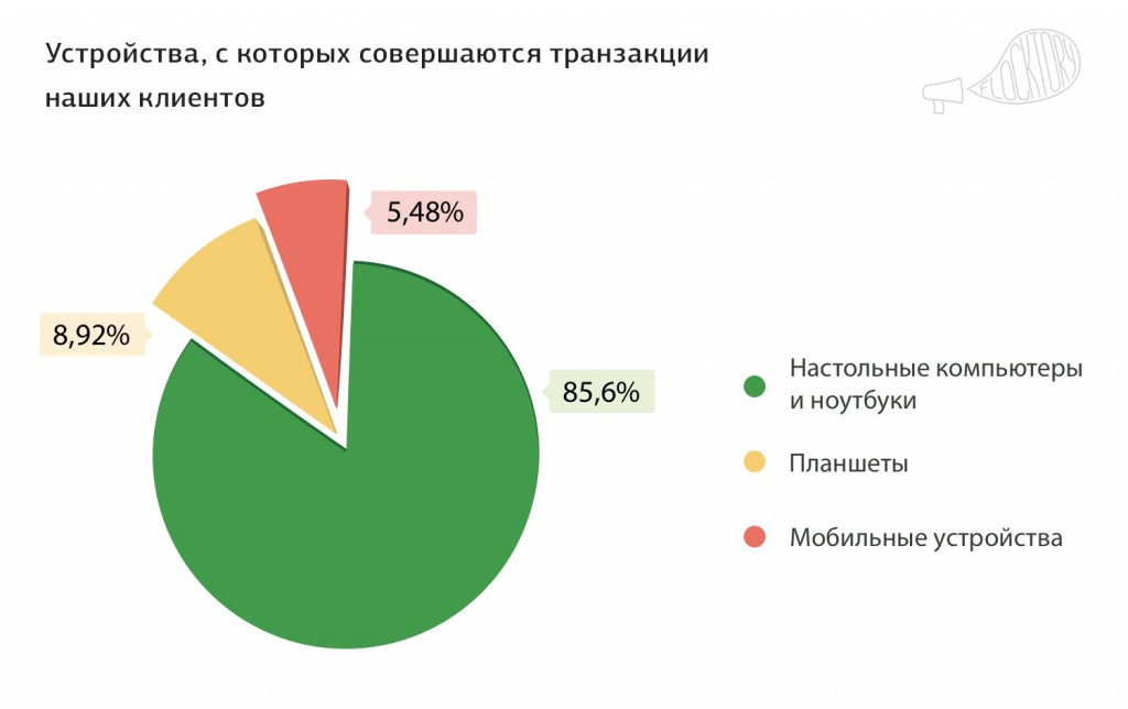 Из данных выше можно сделать выводы о том, что пока все же значительное число покупок люди совершают с привычных всем компьютеров, ноутбуков и моноблоков. В то же время доля планшетов и, что удивительно, мобильных устройств также становится достаточной, чтобы на нее можно было ориентироваться.