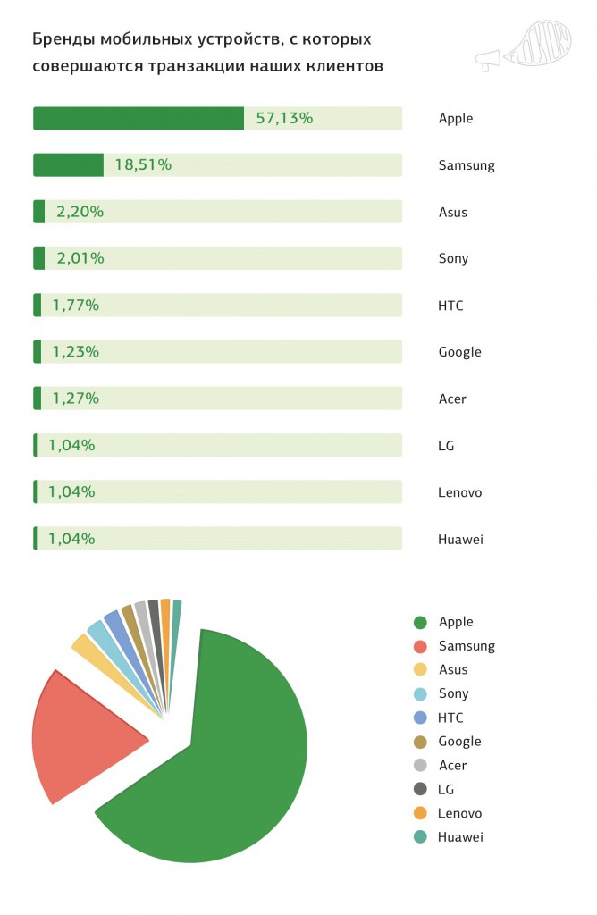 В настоящий момент с нашей платформой интегрирована значительная часть рынка, включая таких крупных игроков как Связной, Ozon, LaModa, E5.ru, Groupon, и еще свыше 500 компаний. Каждый месяц мы наблюдаем свыше 2 млн. транзакций наших клиентов и мы подготовили обзор устройств, с которых совершаются эти транзакции.