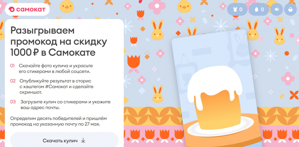 После успешного прохождения испытаний участники получат промокоды на покупки товаров из пасхальной подборки в Самокате. В ней можно найти куличи и пряники собственного бренда.
