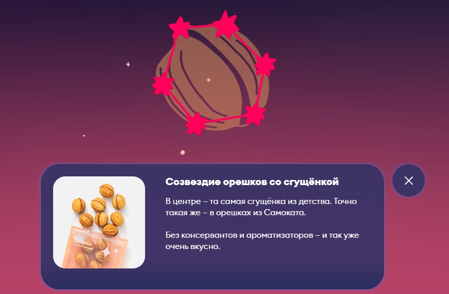 На интерактивном лендинге пользователи могут исследовать "вселенную "Самоката", открывая 15 созвездий с спрятанными в них товарами. Соединяя небесные тела, можно получить промокоды для себя и близких.