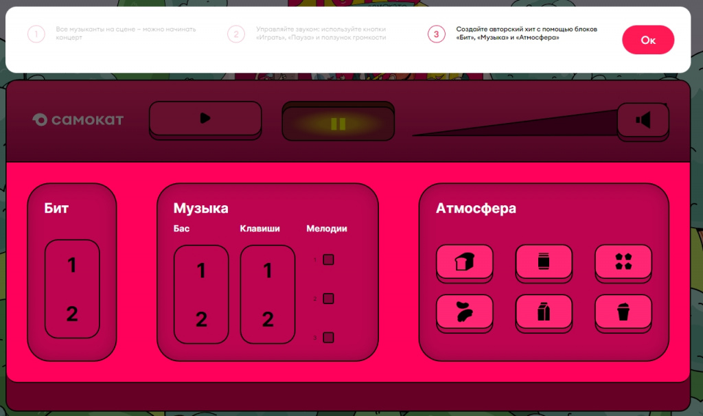 Затем можно написать свой собственный трек, добавив в него звуки своей любимой еды и выбрав подходящие биты, басы, клавиши и мелодии. В финале герои игры - музыканты и продукты от Самоката - исполнят вашу композицию на сцене.