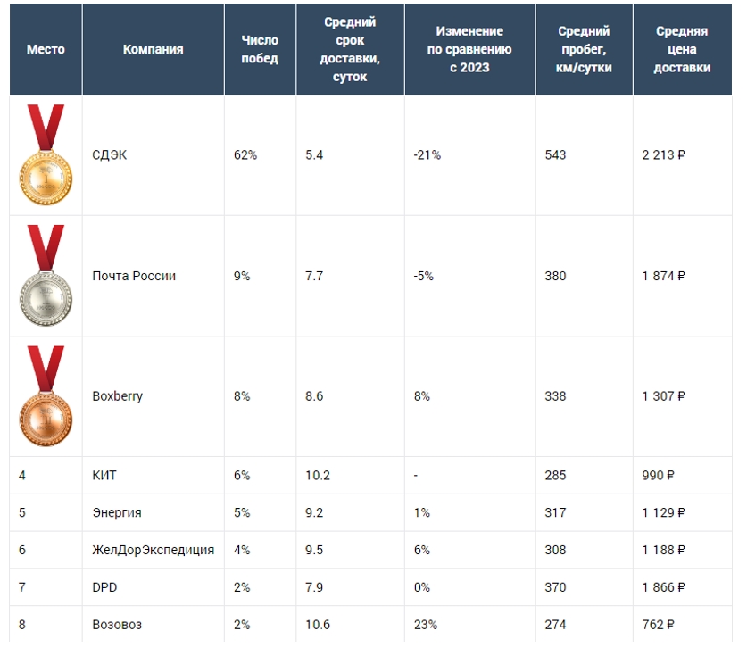 В категории "Лучшие средние сроки доставки" первое место занял СДЭК, обеспечивающий доставку по 64% междугородних маршрутов в среднем за 5,4 дня. При этом среднесуточный пробег составляет 543 км, что подтверждает высокую скорость перевозки. Однако, как отмечают аналитики, стоимость услуг СДЭК также является самой высокой среди участников. Вторую позицию в рейтинге заняла Почта России, чьи средние сроки доставки составляют 7,7 дней. На третьем месте Boxberry с показателем в 8,6 дней.