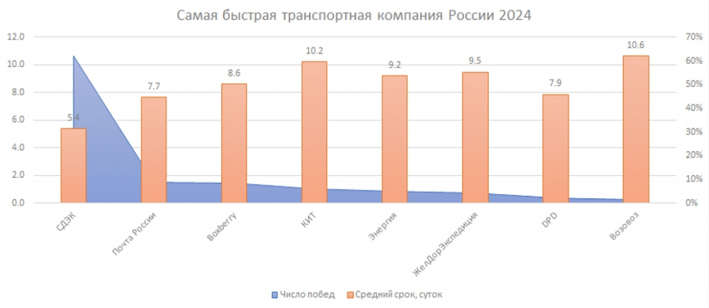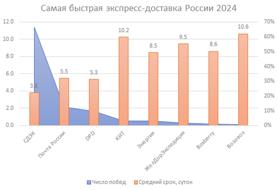 В рейтинге экспресс-доставки СДЭК вновь удерживает лидерство, демонстрируя среднесуточный пробег 771 км, что позволяет доставить груз за 3,8 дня. Почта России с показателем 531 км/сутки доставляет за 5,5 дней, а DPD обеспечивает перевозки со скоростью 546 км в сутки, доставляя за 5,3 дня. Стоит отметить, что у DPD зафиксирован самый значительный рост цен — на 180%.