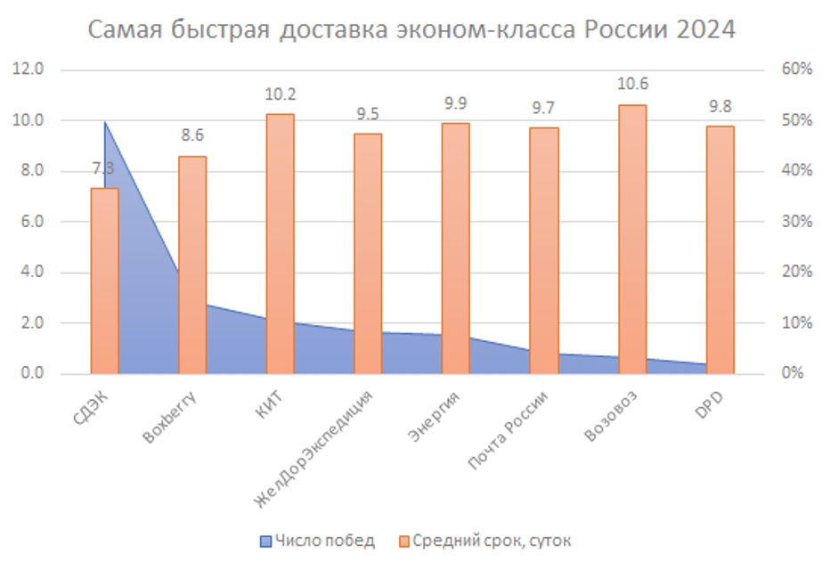 Для эконом-сегмента СДЭК снова занимает первое место, предлагая доставку за 7,3 дня, что на 37% медленнее, чем в среднем по другим тарифам, но зато на 46% дешевле. Вторую и третью позиции в этой категории заняли Boxberry и ТК КИТ соответственно.