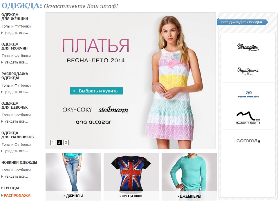 среди которой футболки, джинсы, джемперы, а также предметы верхней одежды, такие как куртки и пуховики.