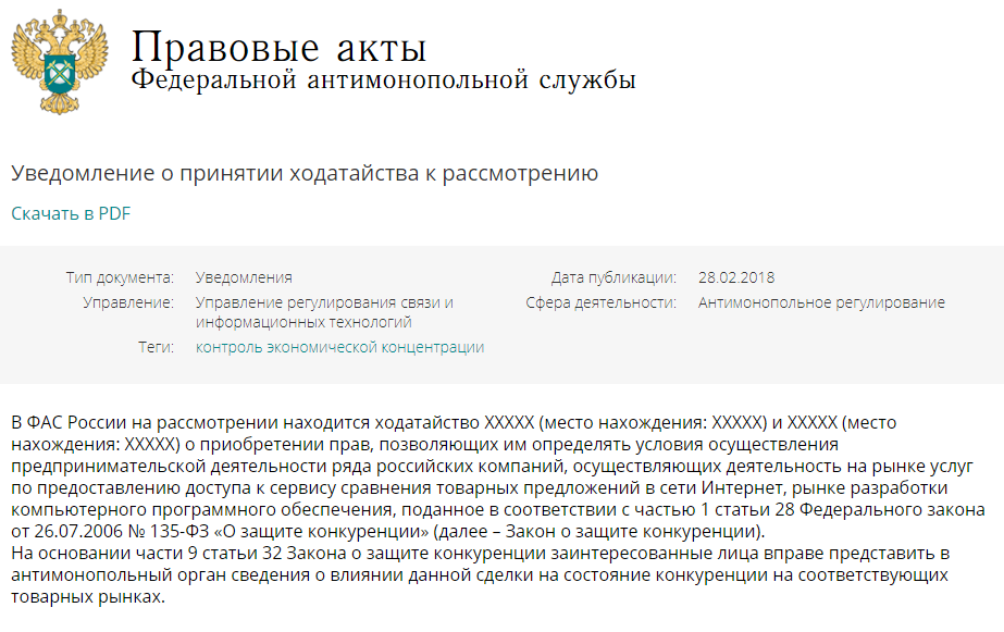 "Сбербанк" подал в Федеральную антимонопольную службу (ФАС) ходатайство на создание совместного предприятия с "Яндексом", сообщает "Коммерсант". Как рассказал глава банка Герман Греф, компании рассчитывают закрыть сделку до конца июня. Ранее банкир говорил, что стороны планируют закрыть сделку в марте 2018 года.