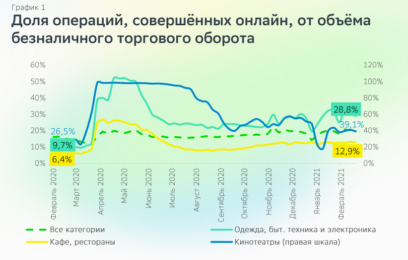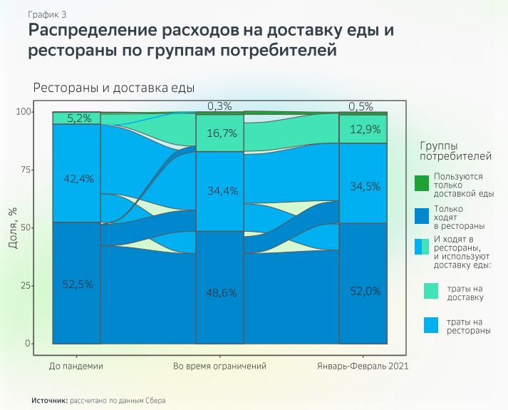 По данным на февраль 2021, россияне тратили в Сети столько же, сколько и во время самоизоляции. 3% от трат домохозяйств перешли в интернет, благодаря этому с апреля по декабрь 2020 года онлайн-рынок вырос на 1 трлн рублей. Во время пандемии доля трат на доставку еды выросла с 5,2% до 17%. После снятия ограничений она несколько снизилась, но тем не менее, в январе-феврале 2021 года составила 13,4%.
