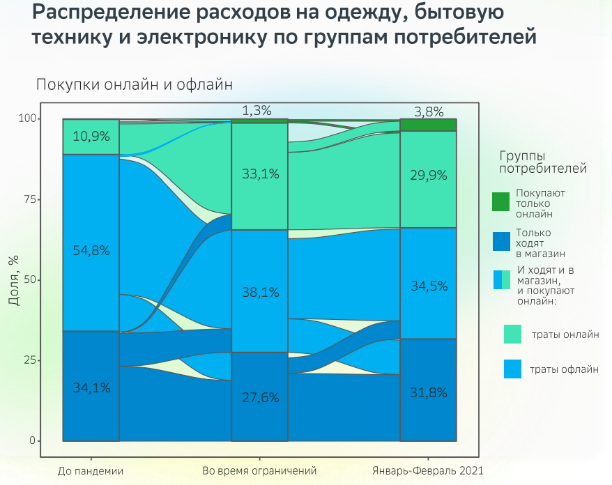 "Формируется группа потребителей, готовых покупать одежду, бытовую технику и электронику только онлайн, на них пришлось 3,8% всех безналичных трат в этой категории в январе-феврале 2021 года", - говорят эксперты.