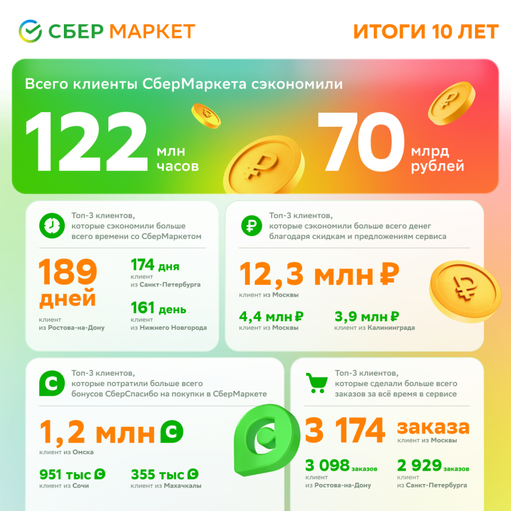 За 10 лет СберМаркет доставил 93,3 млн заказов, а пользователи сохранили 70 млрд рублей из своих семейных бюджетов на скидках и спецпредложениях. Также все клиенты, которые хоть раз сделали заказ в СберМаркете, суммарно сэкономили колоссальное количество времени на походах в магазин. Это 122 млн часов или 13 927 лет.