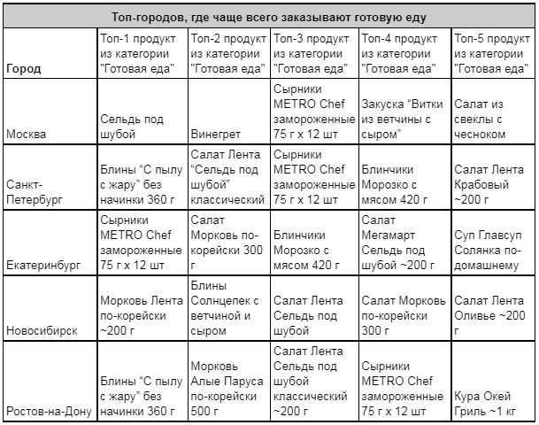 На втором месте по популярности готовой еды — Санкт-Петербург. Третью строчку занимает Екатеринбург. Жители этих городов любят сырники, при этом петербуржцы разделяют вкусы как москвичей, так и екатеринбуржцев: они часто заказывают блины и сельдь под шубой. Столичные жители также часто добавляют в корзину винегрет, а екатеринбуржцы — морковь по-корейски.