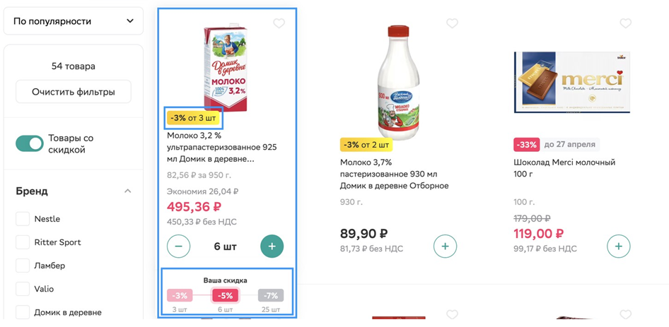 Как это работает: Для всех позиций, участвующих в акции, есть 3 варианта скидки - 3, 5 и 7%. Чем больше единиц товара клиент добавит в корзину, тем выгоднее будет общая стоимость. Средний чек b2b-клиентов СберМаркета составляет от 4500 до 12 000 рублей в зависимости от размера компании. А значит, с одного заказа получится сэкономить в среднем 1000 рублей.
