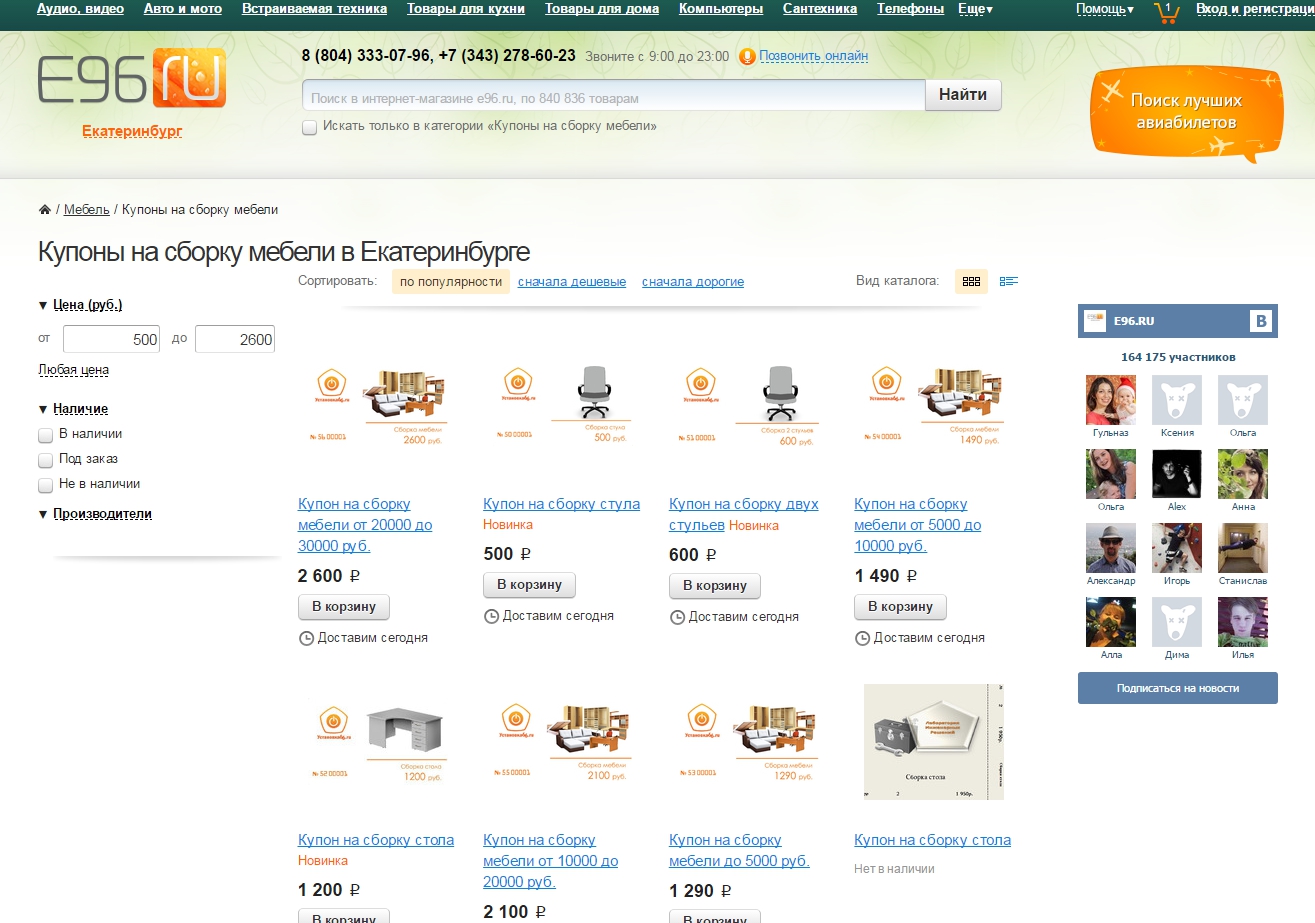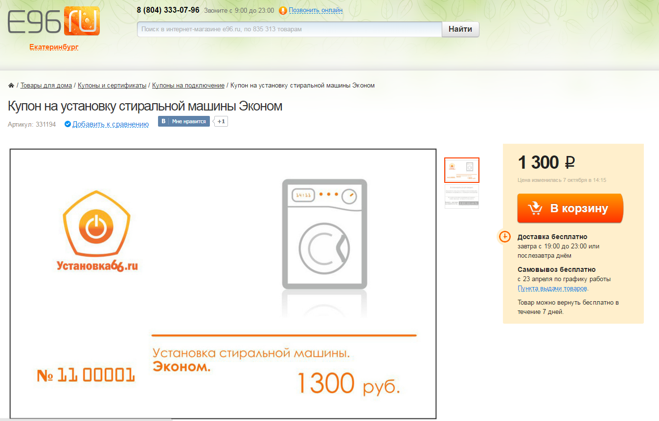 Интересно заказ услуг выглядит в магазине E96. Чтобы подключить стиральную машину, например, тут надо купить специальный купон. Для купонов на сайте есть целый раздел.