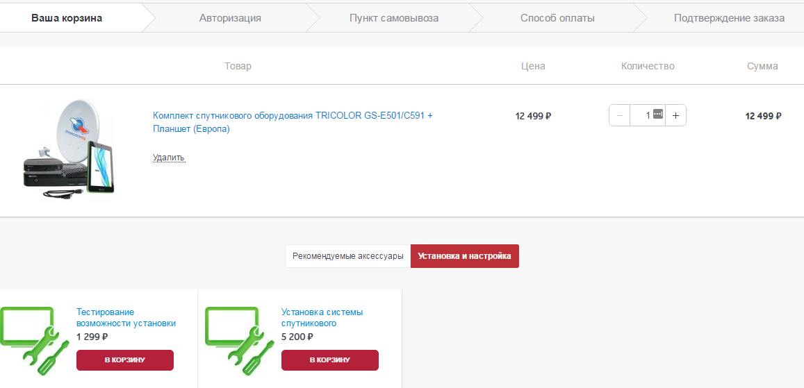 Впрочем, кроме этого раздела услуги на сайте компании можно купить и в карточке товара (специальная вкладка внизу) и в корзине.