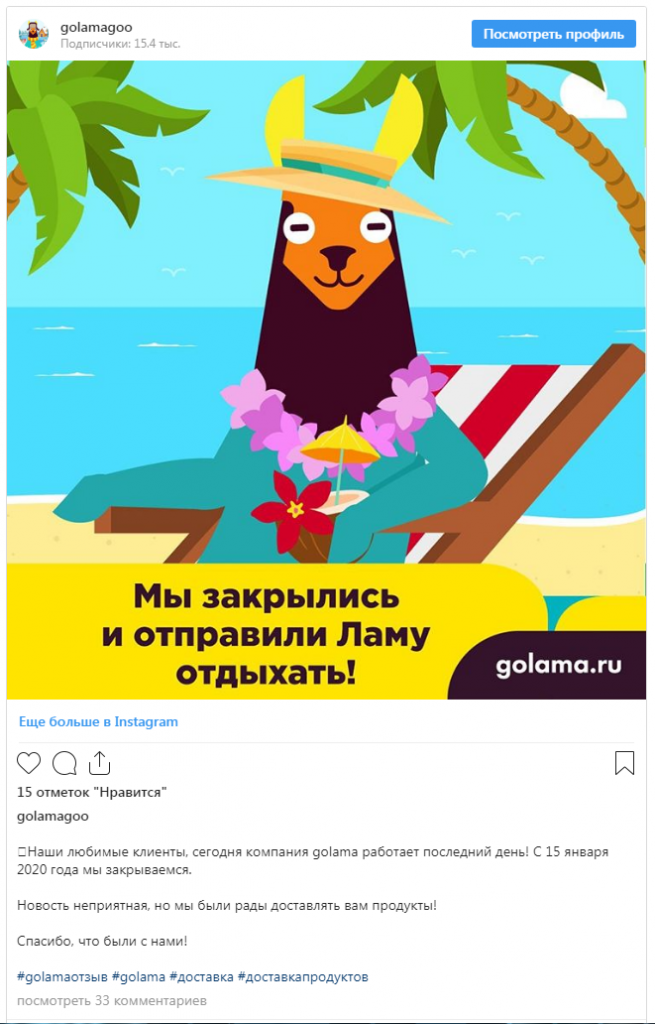 Сервис доставки продуктов Golama объявил о своём закрытии. В инстаграм-аккаунте представители компании говорят, что "отправили Ламу отдыхать". Уже с 15 января сервис работать не будет. Все заказы, созданные до 15.01 покупатели получат.