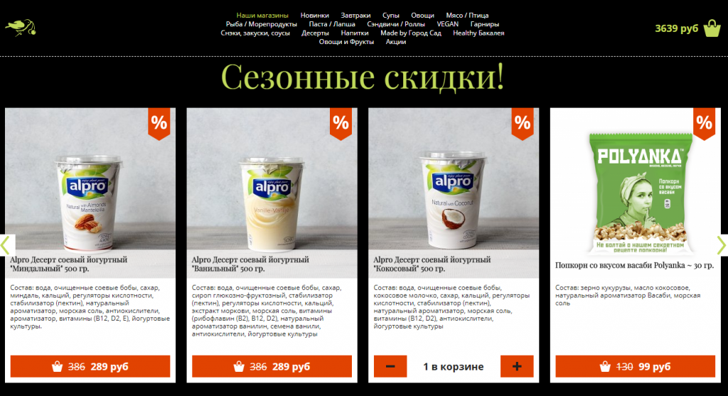 На данный момент на сайте сети уже продают готовую еду, а также кофе, суперфуды, ореховое молоко, хлеб, фрукты, шоколад и косметику. Как рассказывала Лисиченко на профильном круглом столе, сейчас сеть сотрудничает с Delivery Club, FoodFox, Uber.