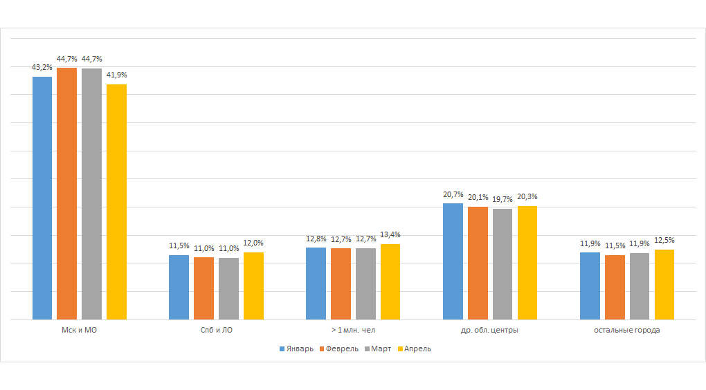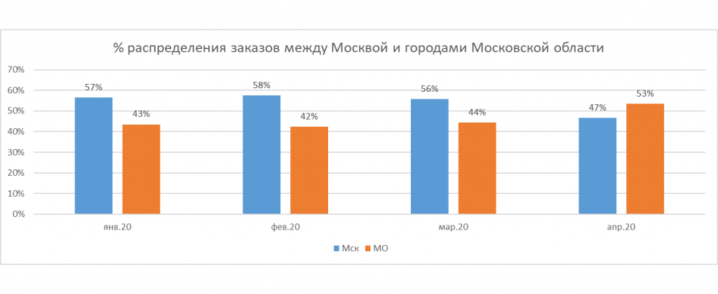 В Санкт-Петербурге и регионах, как и до кризиса, онлайн-покупатели предпочитают самовывоз. В Москве с начала апреля отмечается двукратный рост курьерской доставки, что не коррелирует с остальными регионами. За счет переезда 30% жителей Москвы на период карантина преимущественно в Московскую область, по данным за апрель и май, количество онлайн-покупок с доставкой в область увеличилось на 45%. В Московской области онлайн-покупатели продолжают выбирать самовывоз, не смотря на режим самоизоляции.