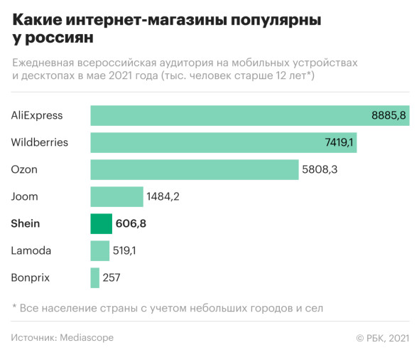 Китайская компания из сегмента ультрафаст-фэшн Shein за год втрое увеличила свою ежедневную аудиторию в России и по этому показателю уже обогнала Lamoda. По данным Mediascope, в апреле на сайт и в мобильное приложение Shein хотя бы один раз заходили 457 тыс. россиян старше 12 лет, в мае - уже почти 607 тыс. Аналогичные показатели Lamoda - 448 тыс. и 519 тыс. человек.