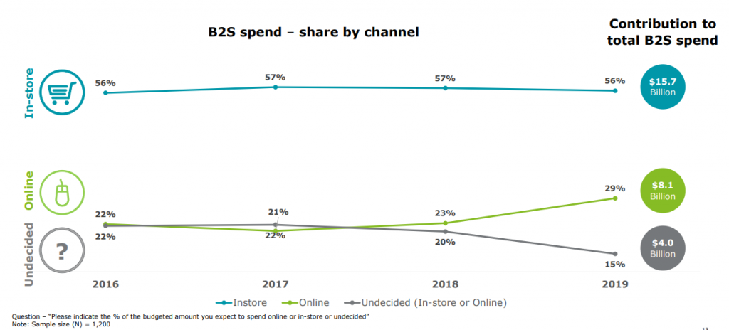 В 2019 году совершать покупки в офлайн-магазинах планируют 56% покупателей, онлайн — 29%, что на 7% выше по сравнению с 2016 годом. Остальные 15% родителей рассматривают оба варианта. При этом одежду и школьные принадлежности чаще покупают офлайн, а электронику и технику — уже в онлайне.