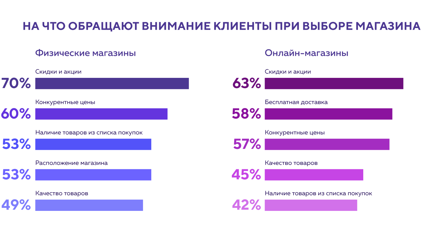 Для пользователей интернет-магазинов важна бесплатная доставка товаров. Покупатели, предпочитающие традиционный шопинг, выбирают магазины с удобным территориальным расположением.