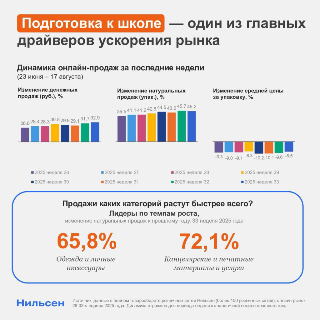Наибольший рост продемонстрировали категории, связанные с подготовкой к учебному году: канцелярские и печатные товары (+72.1%) и одежда с аксессуарами (+65.8%). Наиболее высокая динамика зафиксирована в регионах Юга, Дальнего Востока, Сибири и Урала.
