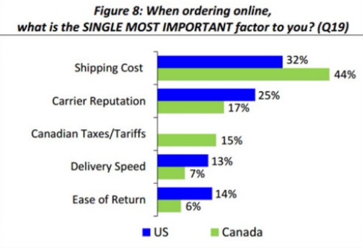 Исследование от логистической компании Purolator International показало, что чаще всего именно стоимость перевозки самый волнующий фактор в доставке для онлайн-покупателей в США и Канаде, и большинство выбирает более дешевый, хотя и продолжительный вариант. Также важными являются репутация транспортной компании, налоги и тарифы, легкость возврата товара.