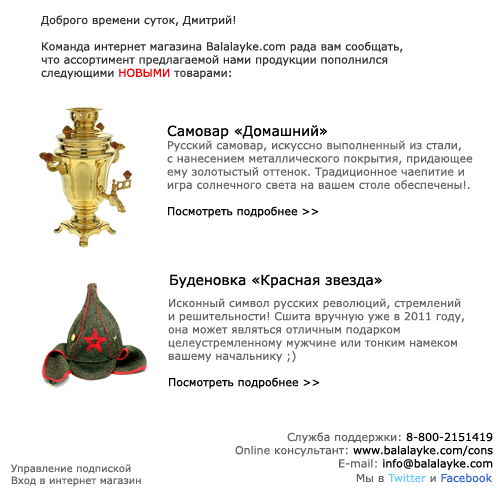 Большая часть ваших подписчиков, так или иначе заинтересована в вашем интернет магазине и его продукции. Иначе они бы не подписывались на ваши рассылки (исключением служит автоматический сбор email’ов и последующая рассылка по ним. Т.е. без оформления пользователем подписки. Почти что спам. Но опять же – как составить ;). Поэтому им будет интересно узнать о появлении того или иного продукта в вашем ассортименте, расширении модельных рядов. В данном случае рассылка является хорошим инструментом для оповещения о новых поступлениях. Не будет также плохо включить в само письмо фотографию данного продукта(ов) и его краткие характеристики. Определитесь с наиболее перспективными категориями, но не переборщите с их количеством, никто не захочет читать рекламный прайс с 50 позициями. Такое письмо, скорее всего, будет закрыто. Оптимальный вариант – 4 товара. При составлении письма учтите, что некоторые почтовые клиенты используют упрощенные системы отображения писем – проверьте конечный вариант письма в разных режимах! Тем самым вы также можете увеличить шансы быстрых продаж своего магазина, напоминая каждый раз своим клиентам о существовании вашего ИМ и его постоянной работе, а также обновлении ассортимента. Идеальный промежуток данных рассылок – раз в месяц.Немного личного