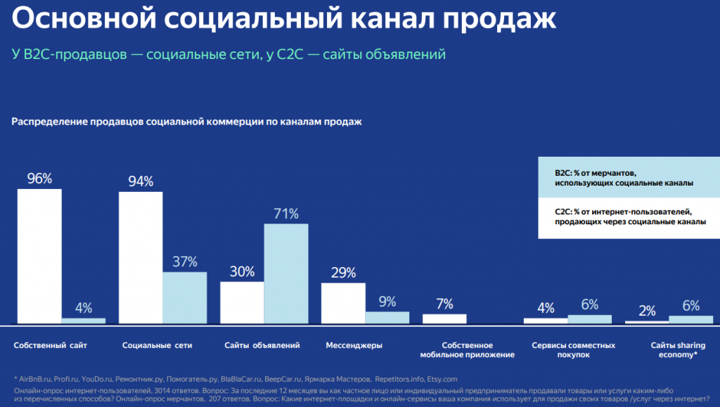 Аналитики изучили продажи в соцсетях, мессенджерах, на сайтах объявлений и сервисах совместных покупок (как B2C, так и С2С-продажи). Кроме того, в исследование попали сайты sharing economy (многочисленные биржи услуг и маркетплейсов с социальными механиками, вроде AirBnB.ru, Profi.ru, YouDo.ru, BlaBlaCar.ru, BeepCar.ru и так далее).