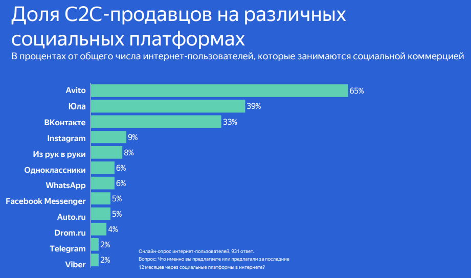 За год 22 млн интернет-пользователей были вовлечены в социальную коммерцию в качестве продавцов в сегменте C2C. Это 31% от общего числа интернет-пользователей России (14-54). Данные получены на основе опроса 3014 человек.