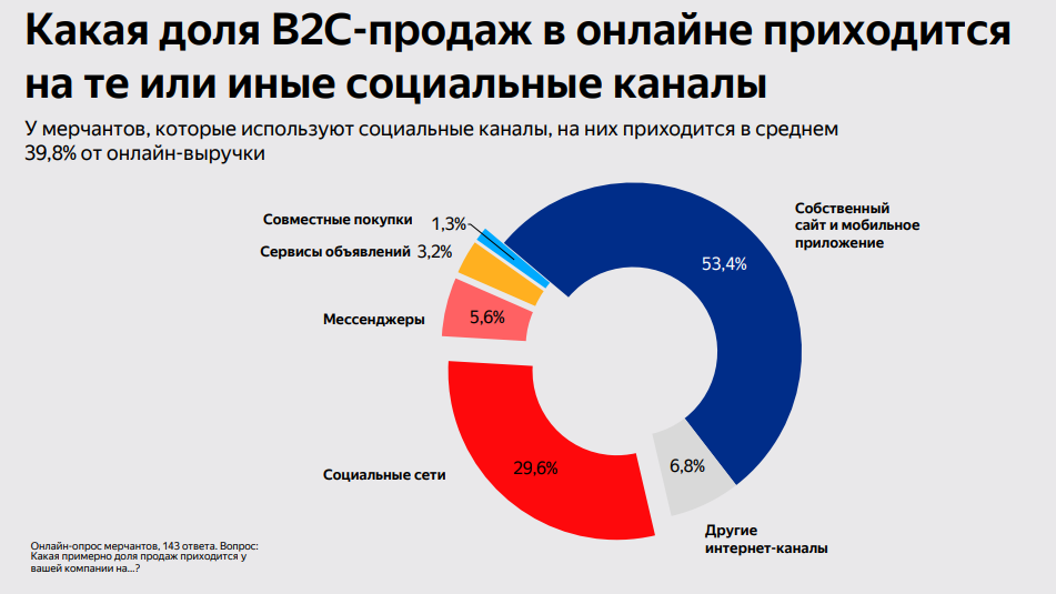 76% компаний, торгующих онлайн, используют социальные каналы как один из источников продажи товаров. В среднем у мерчантов, использующих социальные каналы, на них приходится 39,8% выручки с онлайн-продаж.