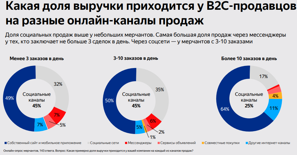 Аналитики отмечают, что в компаниях, которые выполняют не более 10 заказов в день, на долю социальных каналов приходится 45% выручки от онлайн-продаж. При 10 заказах и более - только 25%. В среднем же по рынку около 39,8% выручки онлайн-продавцов приходится на этот канал.