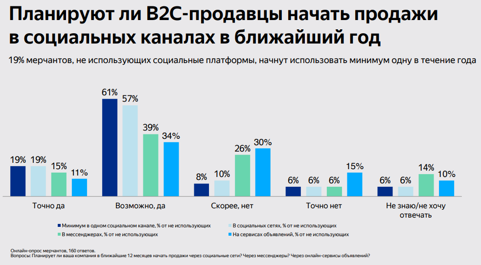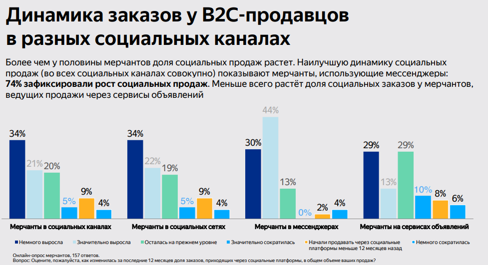 Компании всё активнее учатся продавать через социальные каналы. У 55% мерчантов доля социальных продаж выросла за последние 12 месяцев. Быстрее всего растут продажи у продавцов, использующих мессенджеры: 74% из них отметили рост числа покупок. Чаще всего мессенджеры используются для общения продавца с покупателем (89% компаний), реже — для ведения канала с целью продаж (41%) и для рассылки предложений по клиентской базе (39%). 33% организаций, использующих социальные каналы, работают через чат-ботов.