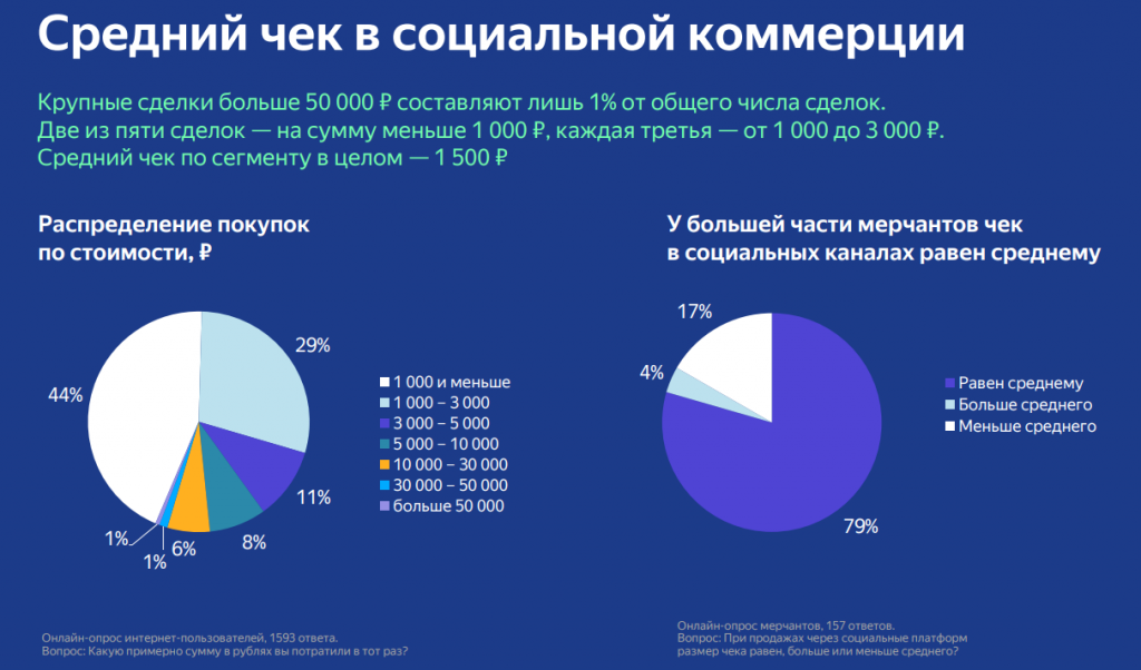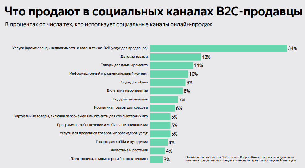 Более чем для половины (55%) интернет-пользователей, которые продают через социальные платформы - это их единственный канал продаж. В среднем же на социальные каналы у них приходится 70% онлайн-продаж.