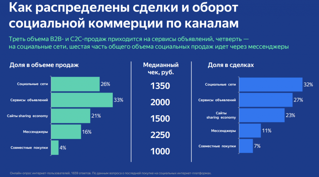 В 2017-2018 годах 33% продаж (в денежном выражении) было совершено на сервисах объявлений. Это почти 27% сделок. При этом почти столько же (32%) продаж пришлось на соцсети.