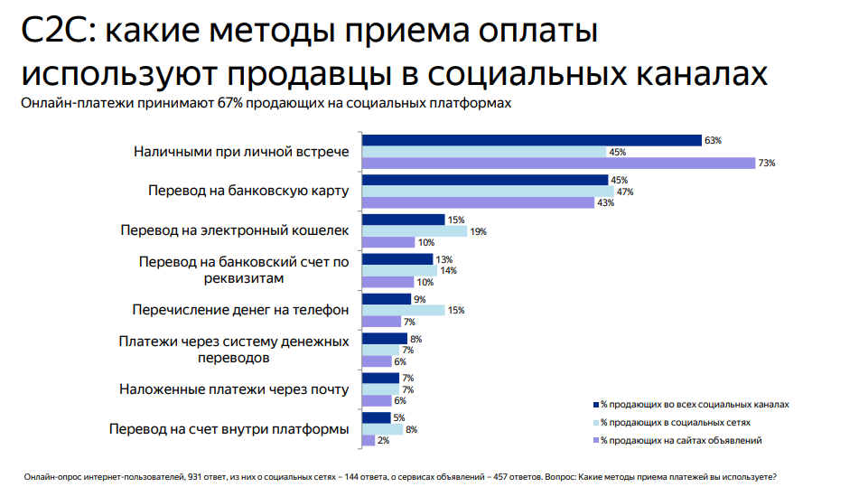 У частных продавцов и компаний приём оплаты устроен по-разному. Компаниям доступны готовые платёжные инструменты, пользователям — сервисы частных переводов. Из C2C-продавцов онлайн-оплату на социальных платформах принимают около 67% респондентов: 45% из них — на карту, 15% — на электронный кошелёк, 13% — на банковский счёт, 9% — на телефон. Оплату наличными принимают 63% опрошенных.