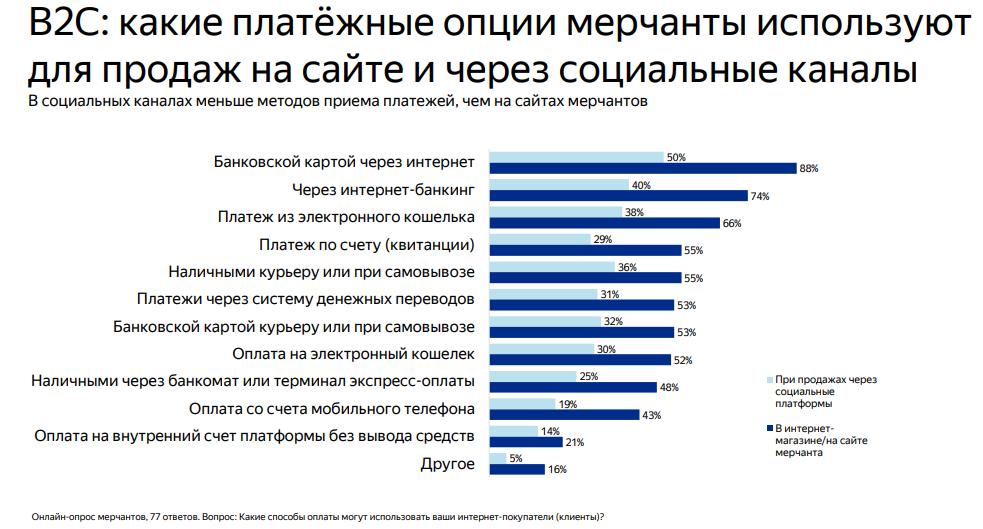 У компаний, торгующих через социальные платформы, ситуация иная: наличные принимают лишь 36% из них (оплата курьеру или при самовывозе). Для расчёта в социальных каналах 50% компаний принимают платежи с банковских карт, 40% — через интернет-банкинг, 38% — из электронных кошельков. Каждая третья компания (31%) осознанно заканчивает сделку не на социальной платформе, а на своём сайте, где обычно выбор платёжных опций шире. Тем не менее 5% компаний планируют начать принимать онлайн-оплату непосредственно в социальных каналах.