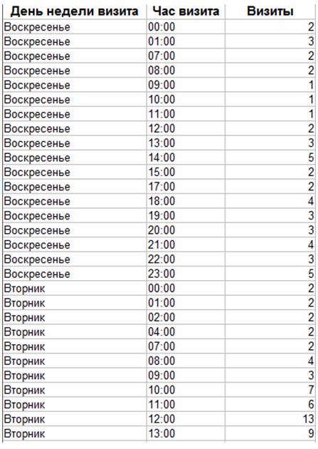 После выгрузки отчета в XLS, для удобства отсортировали данные по дням недели и часам визита.