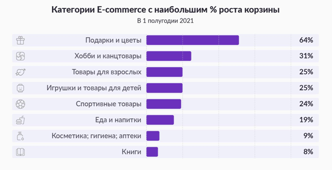 Самой динамично растущей подкатегорией в сегменте онлайн-магазинов стала подкатегория подарков и цветов. Пользователи поздравляли родных и близких, совершая на 79% больше заказов, чем во втором полугодии 2020 года. При этом сумма, которую россияне потратили на подарки и цветы, выросла на 64%.