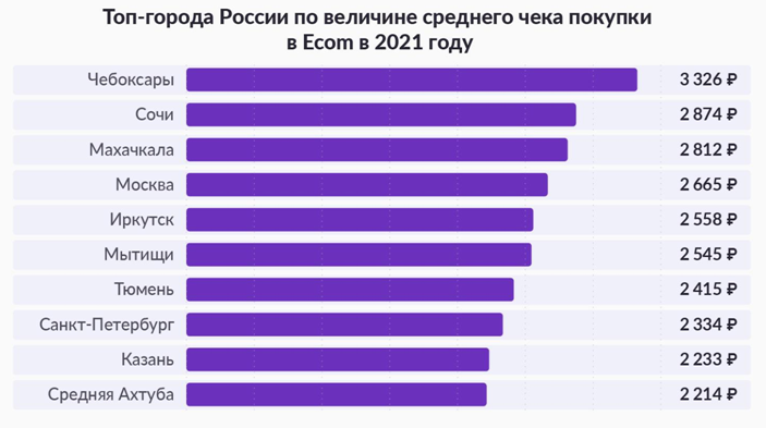 Больше всего заказов онлайн совершили жители Москвы и Санкт-Петербурга, а также Краснодара, Екатеринбурга и Новосибирска. А вот какие города России отличились самым крупным средним чеком в ecom в 2021 году: