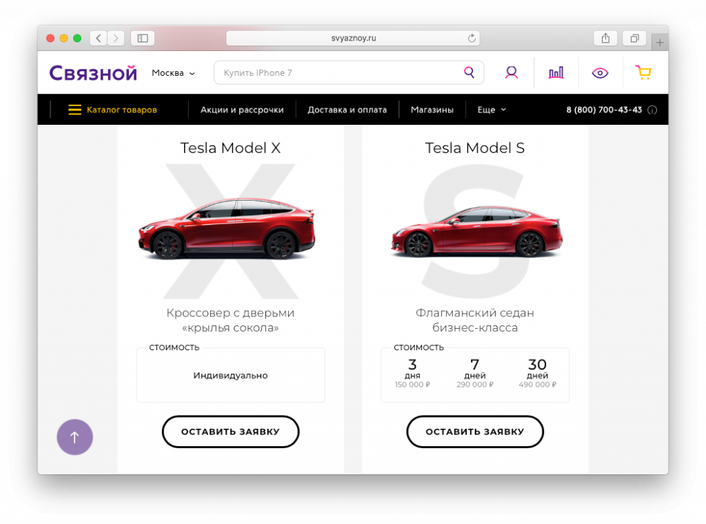Ранее в "Связном" начали принимать онлайн-заказы на покупку электрокаров компании Tesla Motors, реализация которых осуществляется совместно с Moscow Tesla Club. На данный момент через сайт можно купить лифтбек Model S, кроссовер Model X, а также "младший" электрокар Model 3. Кроме того, для предварительного заказа доступен спорткар Roadster второго поколения.