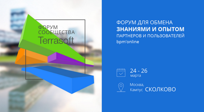 24-26 марта в кампусе бизнес-школы СКОЛКОВО состоится Форум Сообщества Terrasoft, который объединит партнеров и пользователей bpm’online для обмена знаниями и опытом. 3 дня конференции будут наполнены докладами, дискуссиями, общением и мастер-классами.