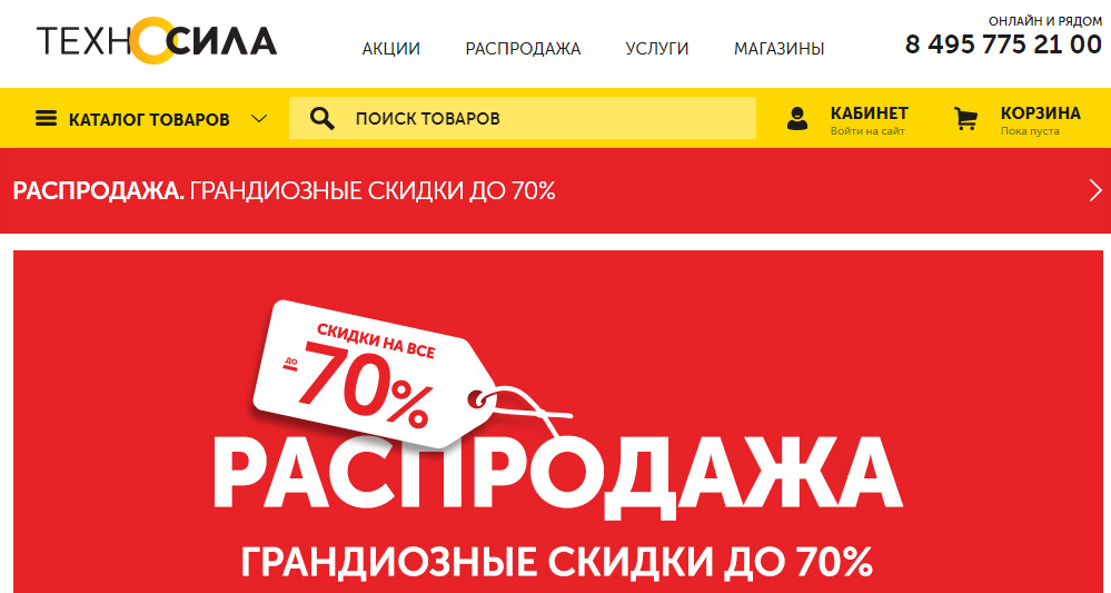 Интересно, что до последнего момента на главной странице "Техносилы" висел баннер о "грандиозной распродаже". Обещали скидки до 70%.
