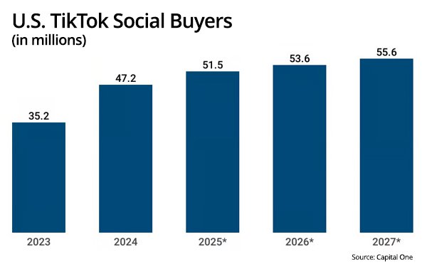 За менее чем два года TikTok Shop занял четвертое место по популярности среди социальных коммерческих платформ в США, согласно отчету Capital One. Ежедневные расходы американских пользователей на платформе составляют около 32 миллионов долларов. В 2024 году число покупателей выросло на 34,2% в годовом исчислении, а к 2027 году ожидается ежегодный прирост на 5,91%.