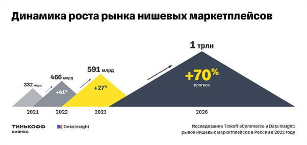 Рынок нишевых маркетплейсов относительно молодой, но активно развивающийся. В 2023 году обороты рынка нишевых маркетплейсов увеличились на 27% и составили 591 млрд рублей. При сохранении текущих темпов роста а объем продаж нишевых маркетплейсов превысит 1 трлн рублей в 2026 году.