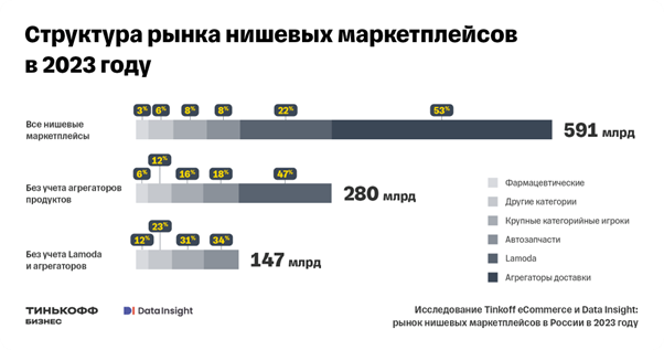 "Последние несколько лет на рынке постоянно обсуждают нишевые маркетплейсы. Это активно растущий сегмент, который в ближайшие годы может достигнуть 1 трлн рублей, и очень важно не упустить этапы его развития. В 2023 году, когда большие интернет-магазины начали переходить на модель нишевых маркетплейсов, а в новостях каждую неделю появляются упоминания новых подобных площадок, не разбираться в них уже просто стыдно. Tinkoff eCommerce и Data Insight решили проанализировать эту молодую прогрессивную нишу и наконец отметить на карте рынка этих игроков.