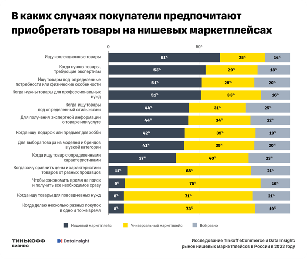 Половина покупателей скорее выберут совершить дорогостоящую или редкую покупку на нишевом маркетплейсе, а не на универсальном. Так, покупатели приходят на нишевые площадки за: